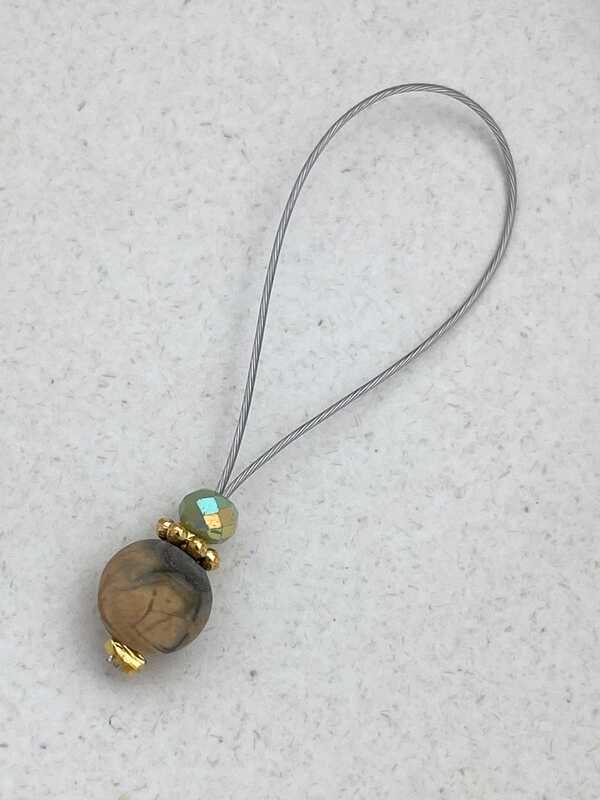 Stitch marker with multicoloured picasso jaspis pearl, golden pearlcape and a facetted applegreen glass pearl on a matching wire