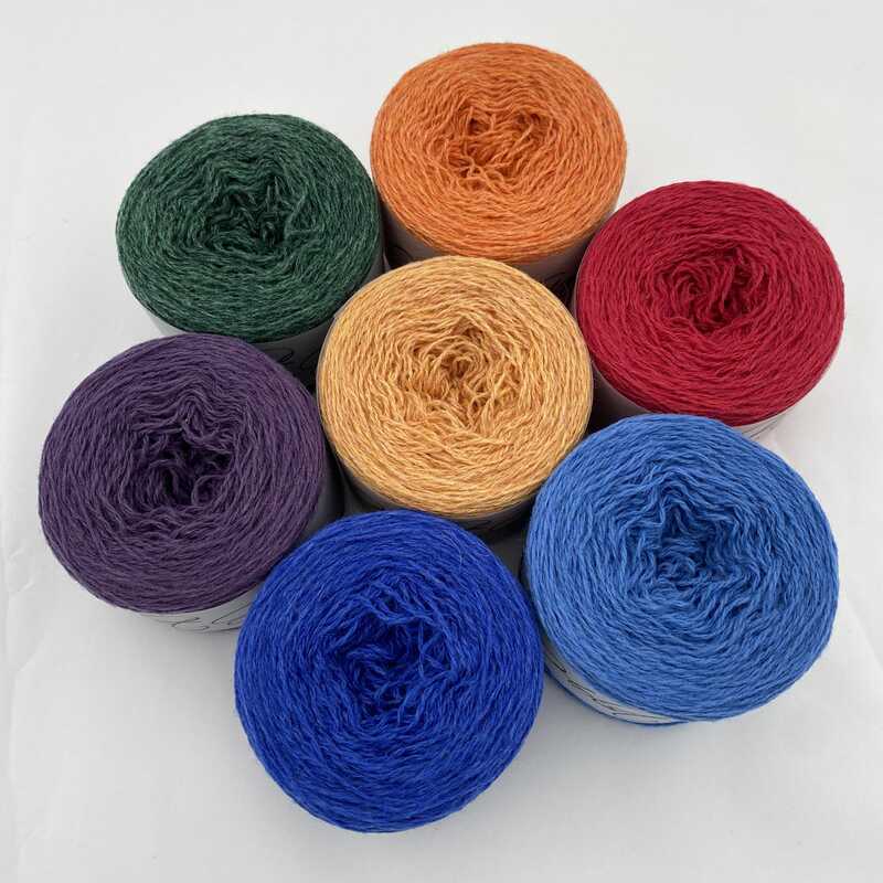 Hver pakke indeholder Supersoft Sunrise, Clementine, Poppy, Cornflower, Cobalt, Devine og Clover Leaf - 50 gram af hver.