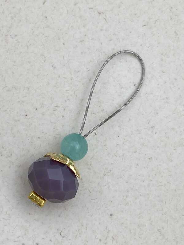 Maskemarkør med lilla facetteret perle, guldfarvet bladperlekappe og en turkis jade på en matchende wire