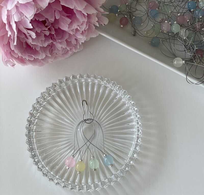 Sæt med 4 maskemarkører med pastel farvede perler på en matchende metal sikkerhedsnål.