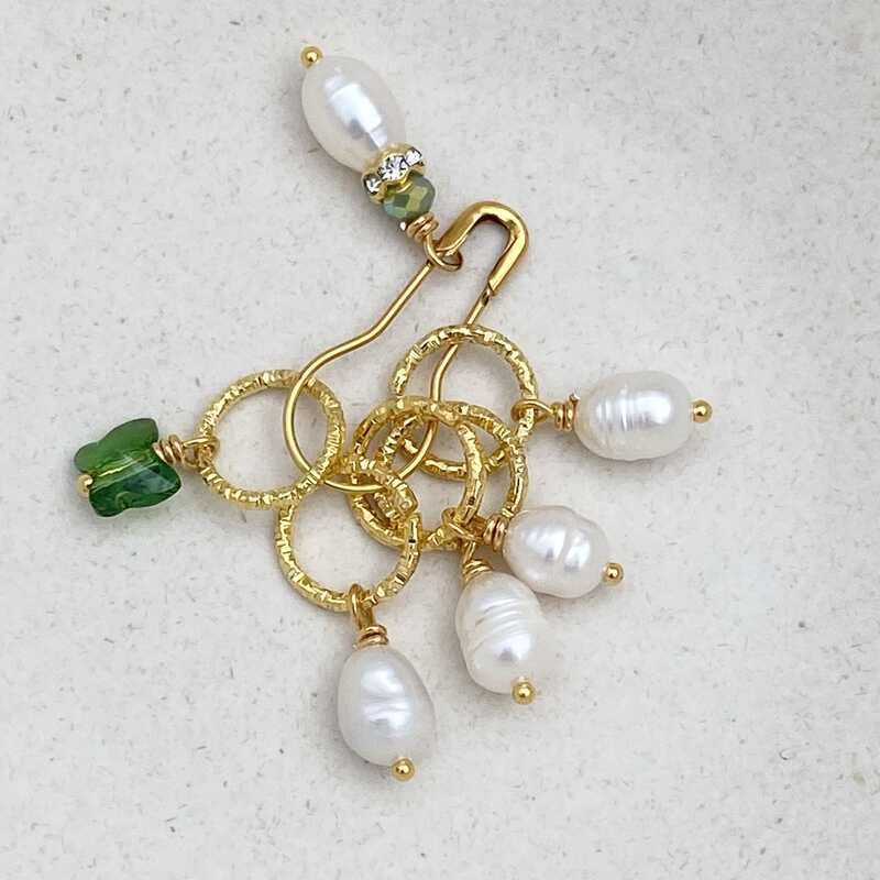 Forgyldte snoede markørringe - 4 med hvide ferskvandsperle og 1 med en grøn swarowski sommerfugl; Samt en rækkemarkør med drop med ferskvandsperle, rhinestone rondel og grøn facetsleben glasperle
