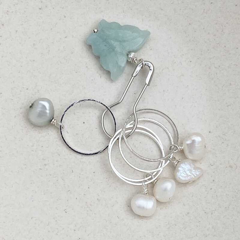 Forsølvede glatte flade markørringe - 4 med hvide ferskvandsperler og 1 grå ferskvandsperle; Samt en rækkemarkør med sommerfugl i amazonit
